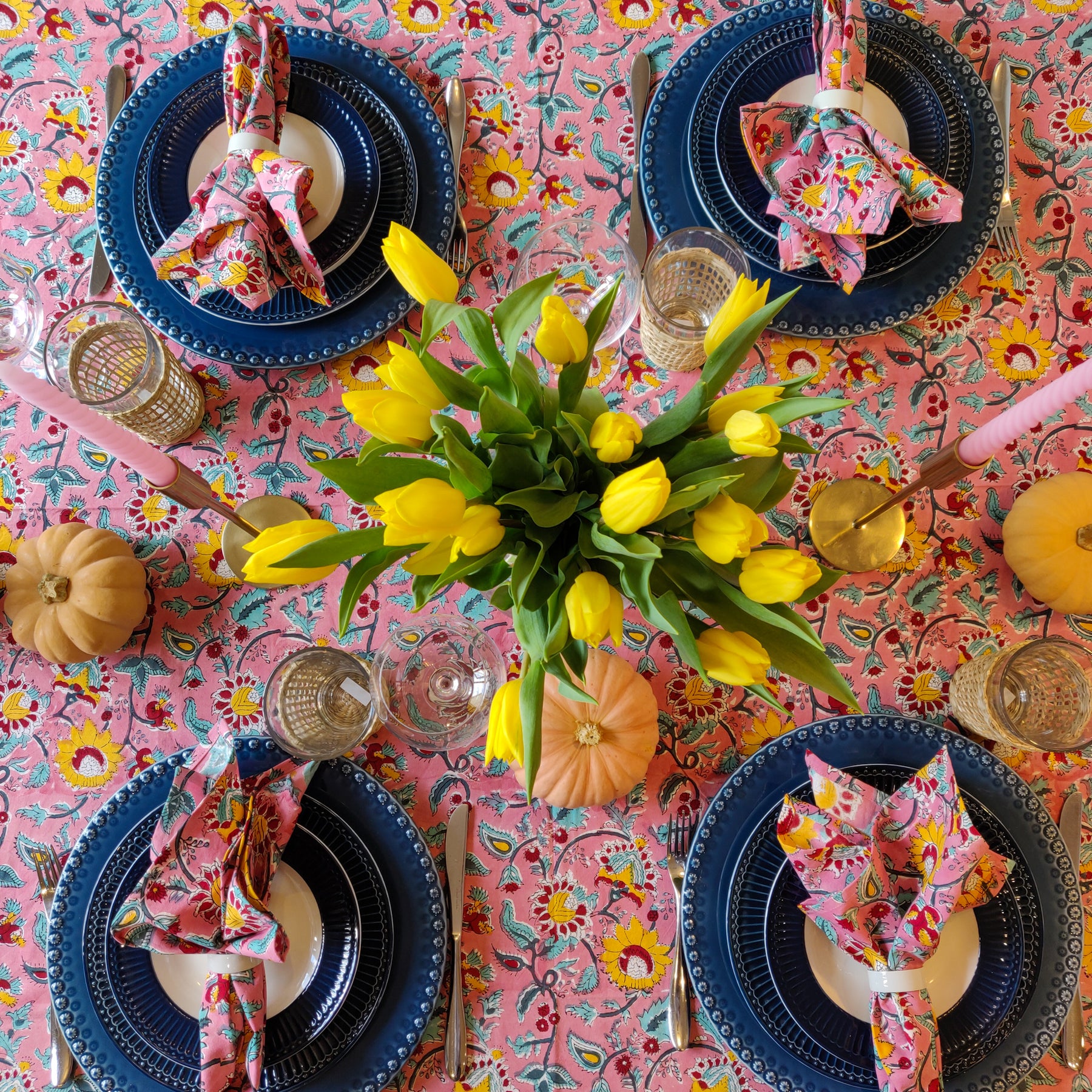 The Daphne napkins are a floral block print in pink green and yellow tones. As they are hand printed, each set will have a unique look. They look perfectly matched with the Daphne tablecloths , a perfect setting. 100% Cotton. 45x45cms. |