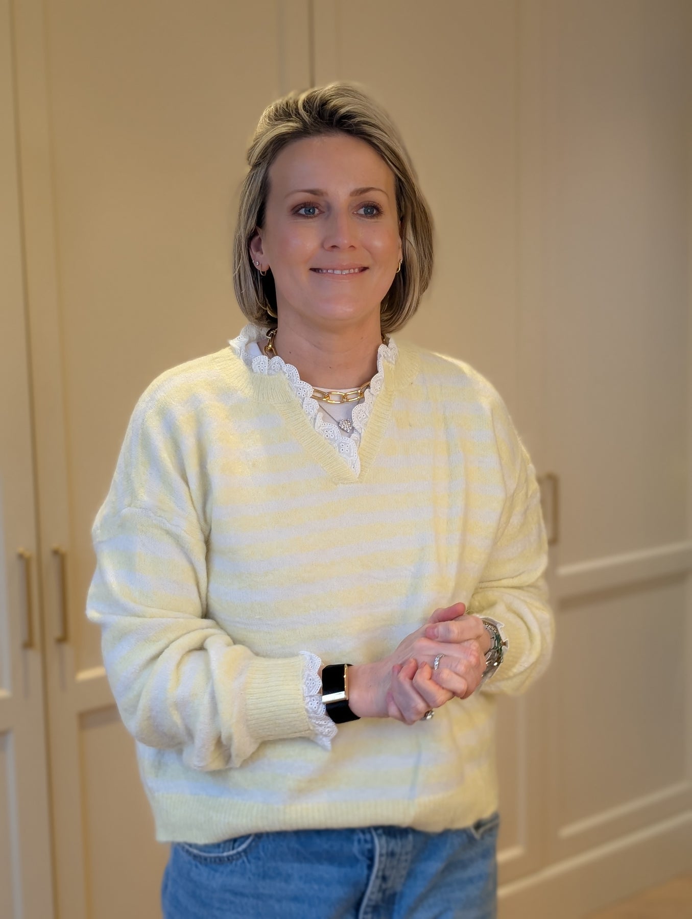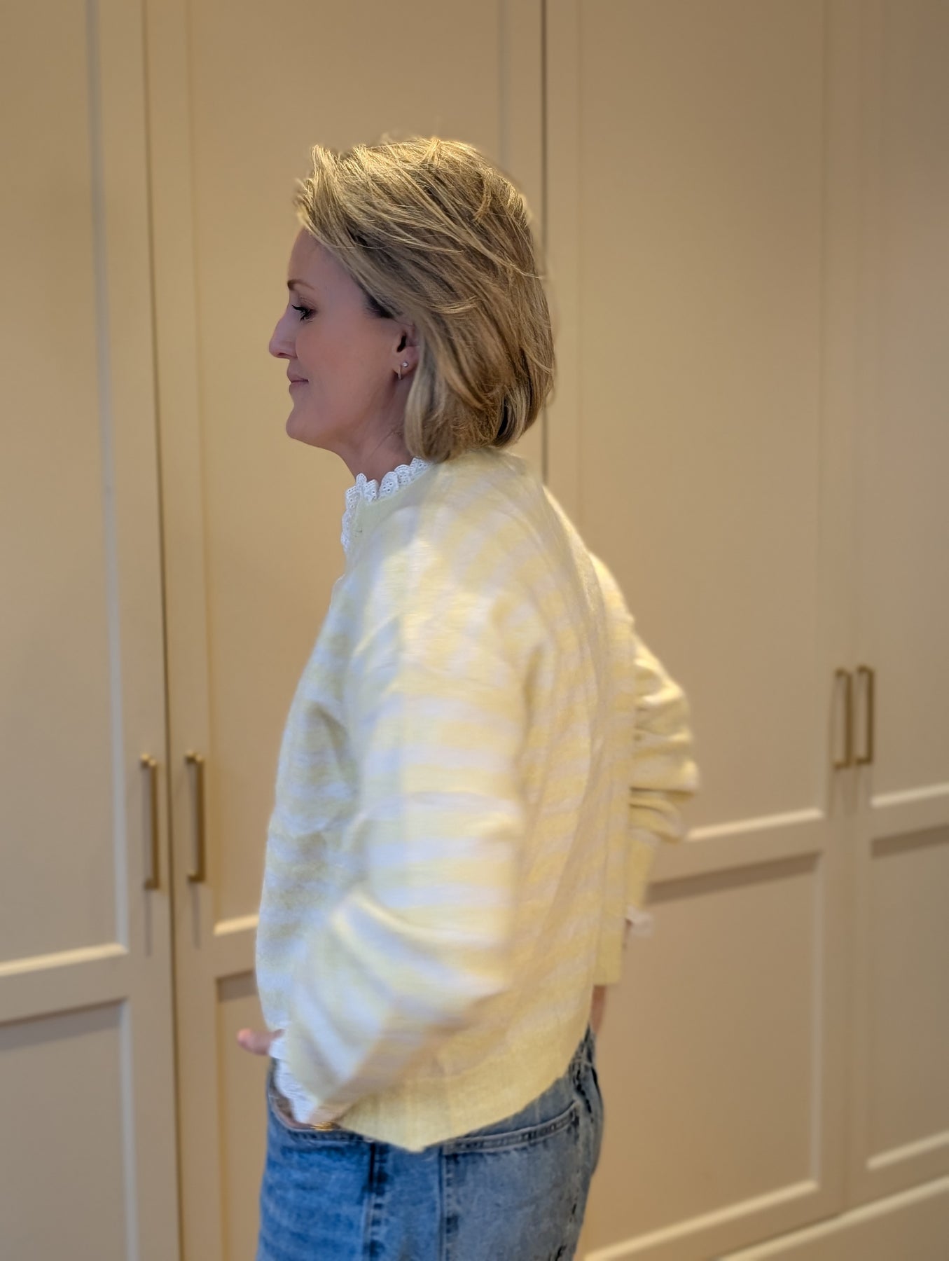 The perfect spring sweater , warm but bright and honestly as soft as butter. Beautiful lace trim detail. This is available in a rose pink and lemon . Both so pretty