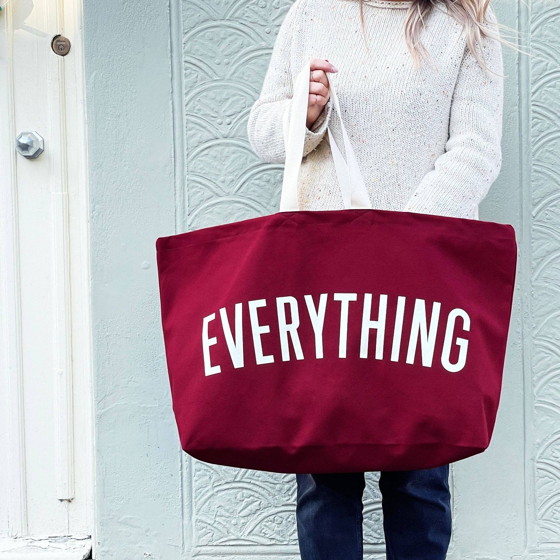 * Made in the UK * 15oz thick burgundy canvas * Deep flat base * Screen printed in off-white * Mid-length handles * 730mm by 440mm by 170mm (28¾ by 17½ by 6¾ inches) Everything Really Big Bag - Weekender Bag - Giant Canvas Grocery Bag - Large Canvas Shopper - Oversized Canvas Bag - Large Tote Bag - Maxi Tote - Huge Shopper - Heavy Duty Canvas Weekender - Massive Christmas Bag - Mum Bag - Mom Tote - Burgundy - Ruby - Garnet - Festive tote - Christmas hamper bag