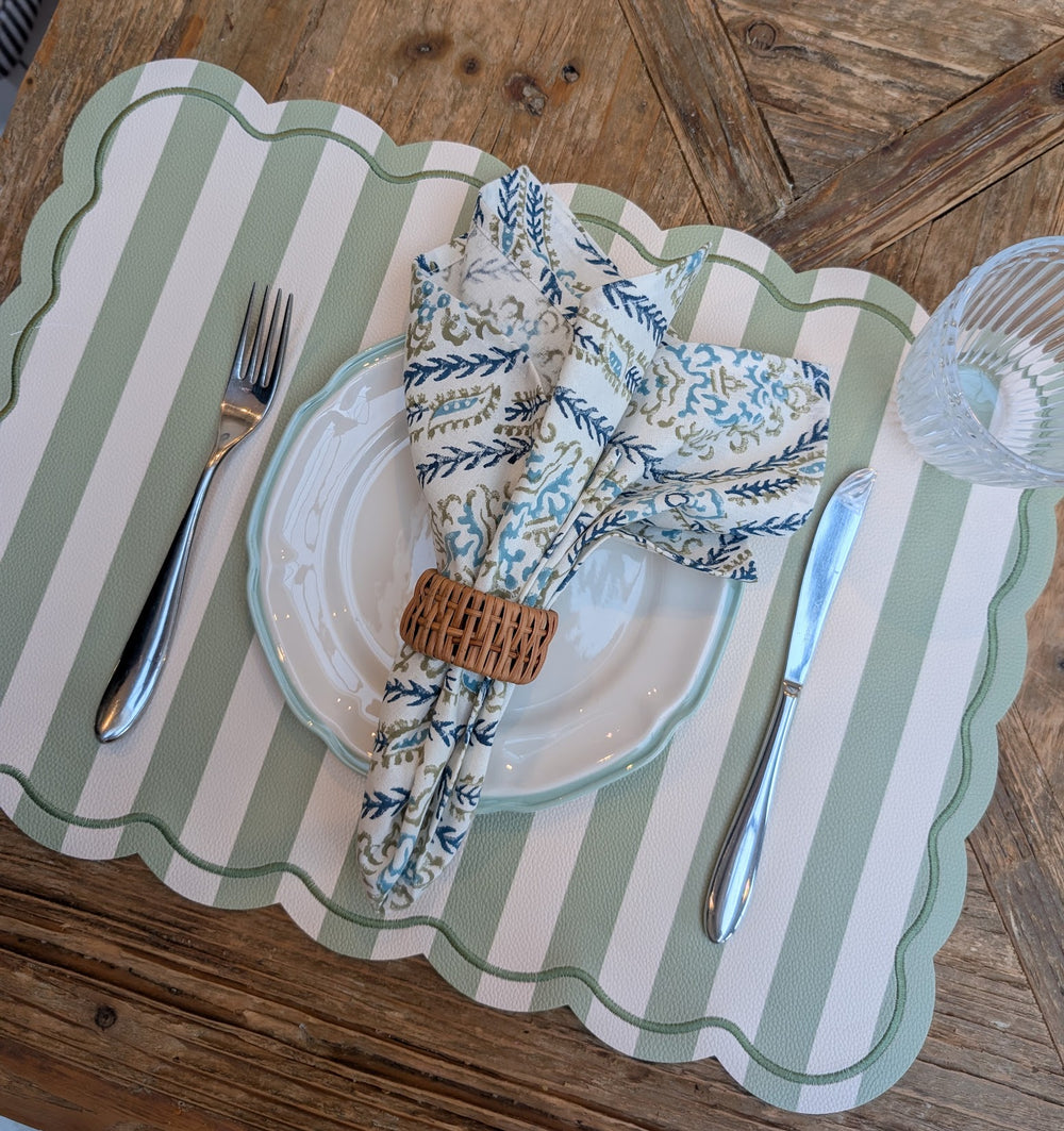 Featuring a floral block print in serene shades of blue and green, each napkin is hand printed by skilled artisans in India. Made from 100% cotton, they bring timeless beauty and artisanal craftsmanship to everyday dining and special occasions alike.