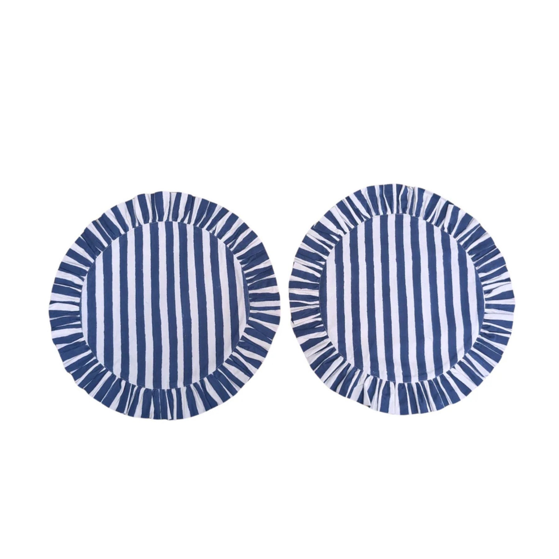 Bring playful sophistication to your table with the Iris Blue Stripe Frill Placemats. Hand block printed by artisans in India, each round placemat features bold blue stripes and a charming frilled edge.