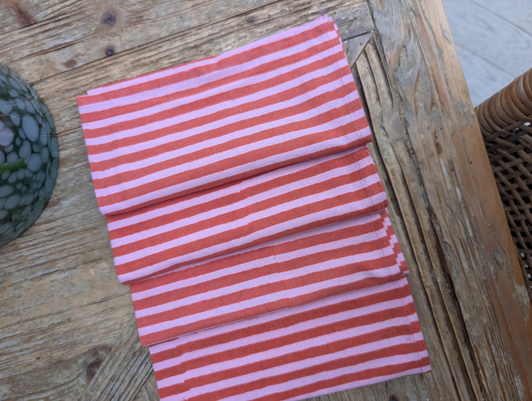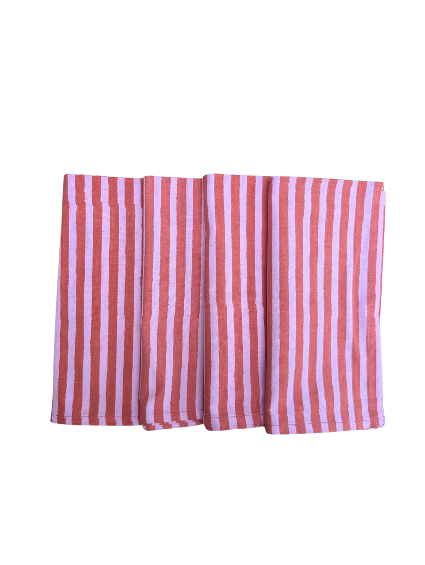 The Red Stripe napkins are handmade  printed Indian block print in pink .  As they are hand printed, each set will have unique look.