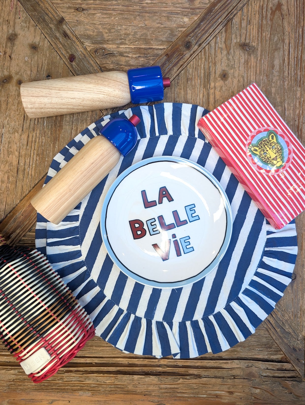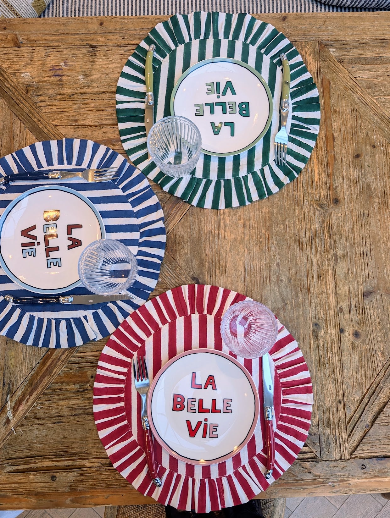Bring playful sophistication to your table with the Iris Blue Stripe Frill Placemats. Hand block printed by artisans in India, each round placemat features bold blue stripes and a charming frilled edge.