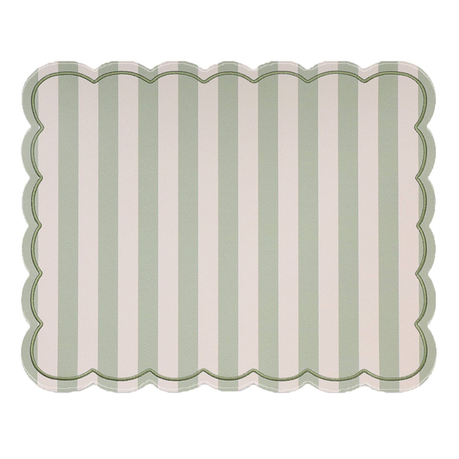 Roméo rectangular placemat matcha stripe 35x48cm Striped faux leather table set, wavy edges. With contrasting embroidery for an original touch. A wipe with a sponge is enough to clean it. Care: clean with a damp cloth. Material: 90% PVC, 10% polyester Color: matcha stripe