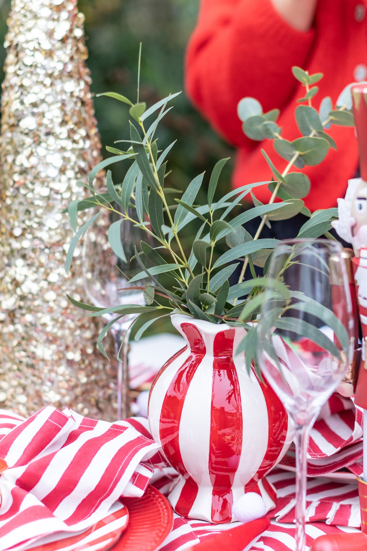 Handcrafted from earthenware and finished with glossy red and white stripes, it brings a vintage, candy-shop charm to any table or shelf. Perfect for fresh blooms or as a stand-alone statement piece.