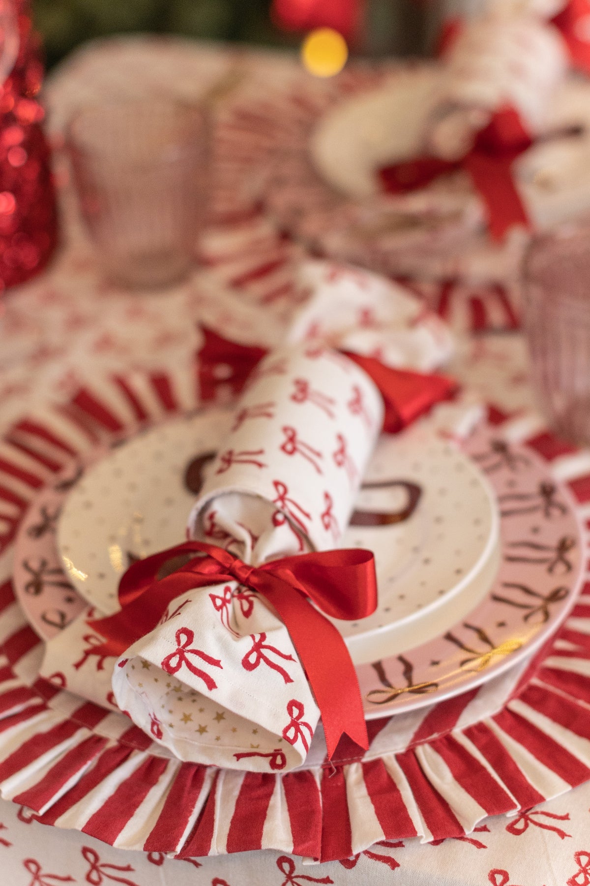 Bring a touch of festive charm to your table with this elegant ceramic plate featuring a red bow motif.