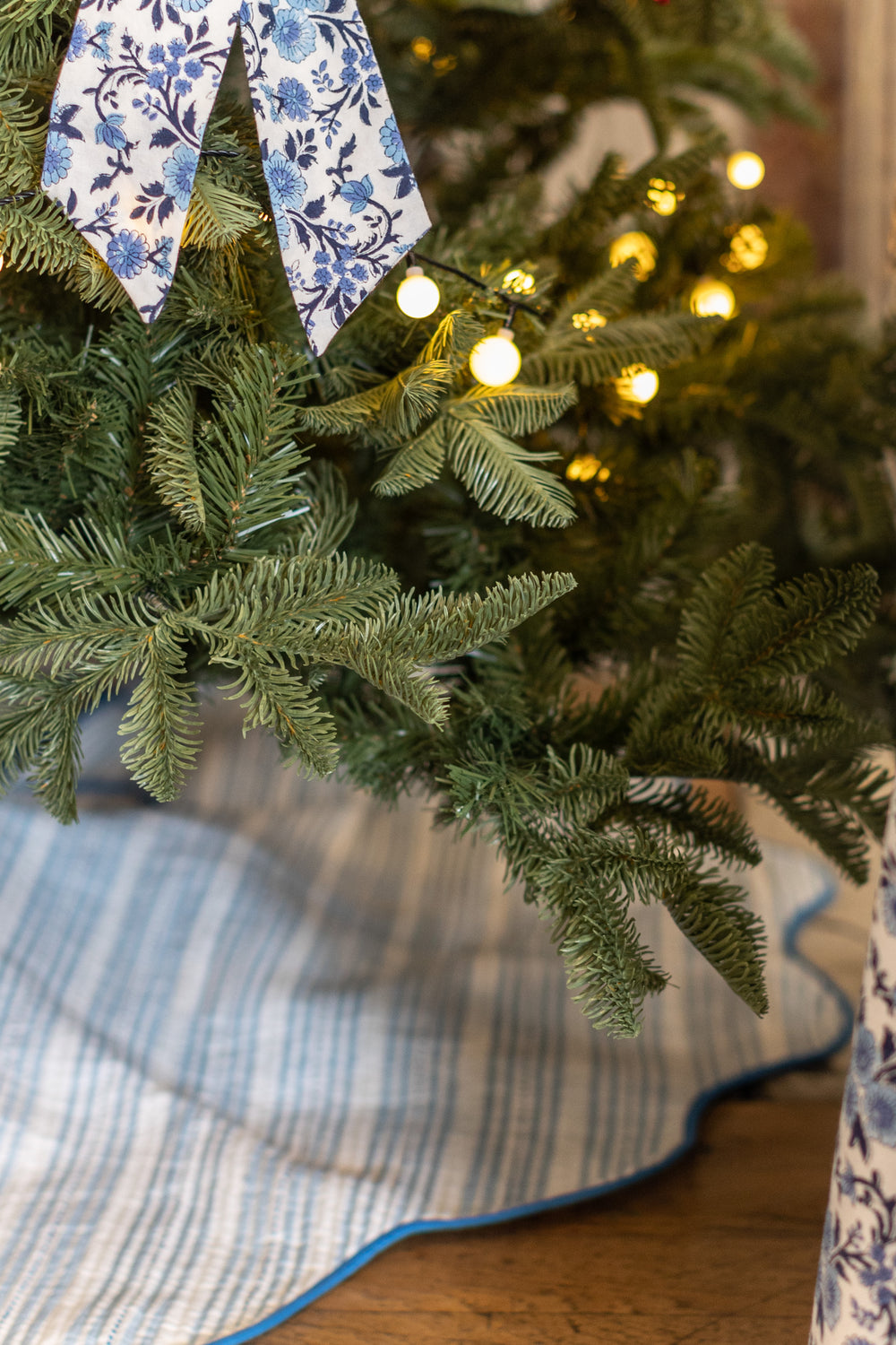 Add a touch of luxury to your Christmas decor with our hand block printed quilted tree skirt. Handmade in Jaipur, this stunning piece features a scallop edge and intricate design, making it a truly unique addition to your holiday festivities. Elevate your home with our exclusive and sophisticated tree skirt.