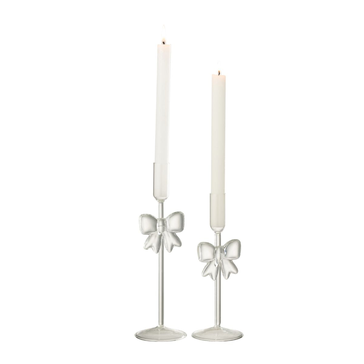 Set of two transparent glass candle holders with sculptural bow design, elegant festive décor.