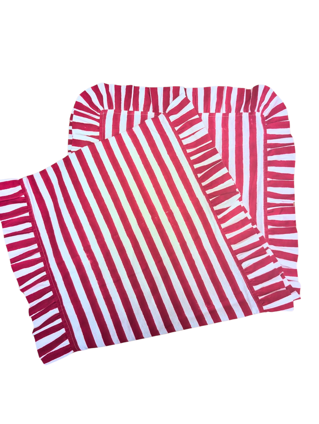 The Holly table runner is hand printed bold red stripes on a white cotton base. As this has been handmade each runner will be individual. Can be used all year round. Edged with a frill boarder for even more fun!