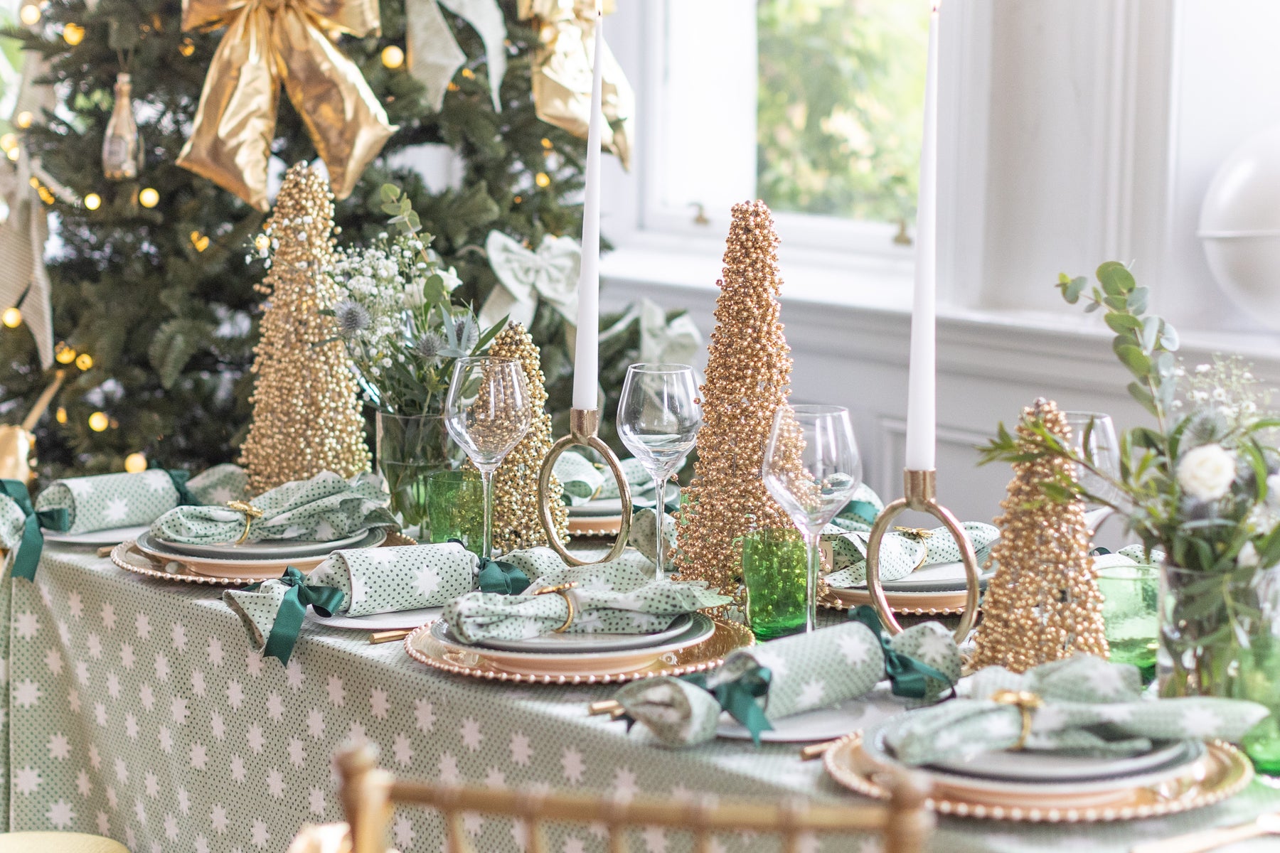 The Mistletoe tablecloth is a printed tablecloth in a star print with green tones. It has been hand block printed in India by talented artisans. As it is hand printed, each tablecloth will have unique look.
